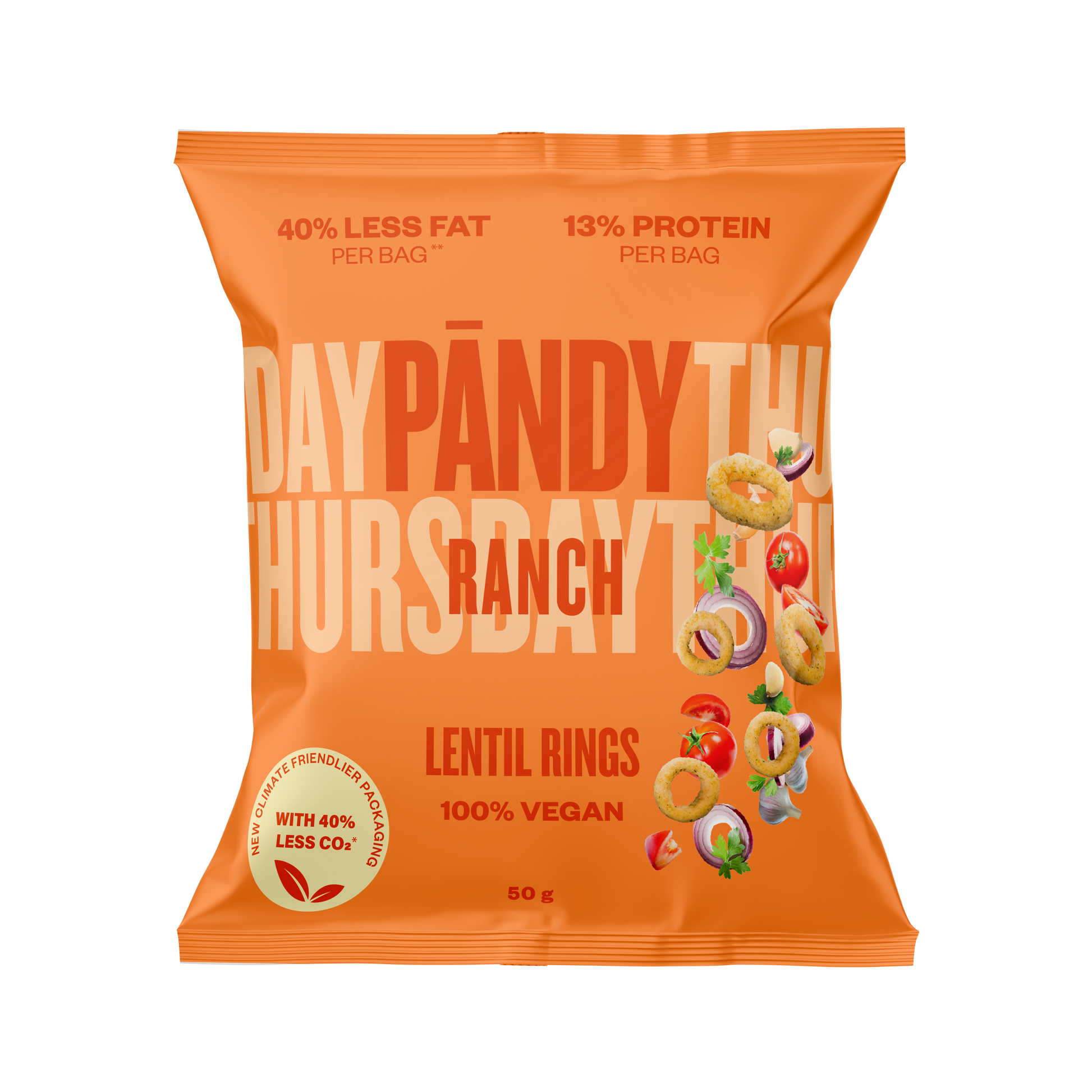 Linsringar med smak av ranch. Ingredienser: Mjöl av röda linser (42%), majsmjöl, rapsolja, rismjöl, kryddmix (rismjöl, salt, vitlök, socker, chili, lök, naturliga smaker, jästextrakt, dextros, citronsaft, kryddextrakt), salt. Kan innehålla spår av spannmål som innehåller gluten, mjölk och deras produkter.
