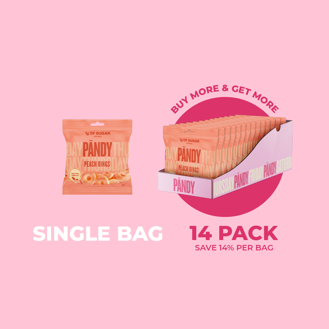 Peach Rings – our first-ever candy combining both foam and jelly. They meet and create the perfect texture with a sweet flavour of peach.