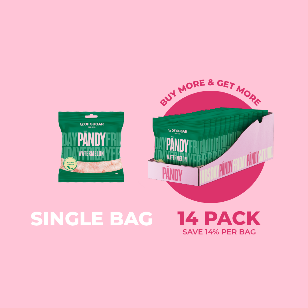 Gummy candy with watermelon flavour, no added sugar. Contains sweeteners