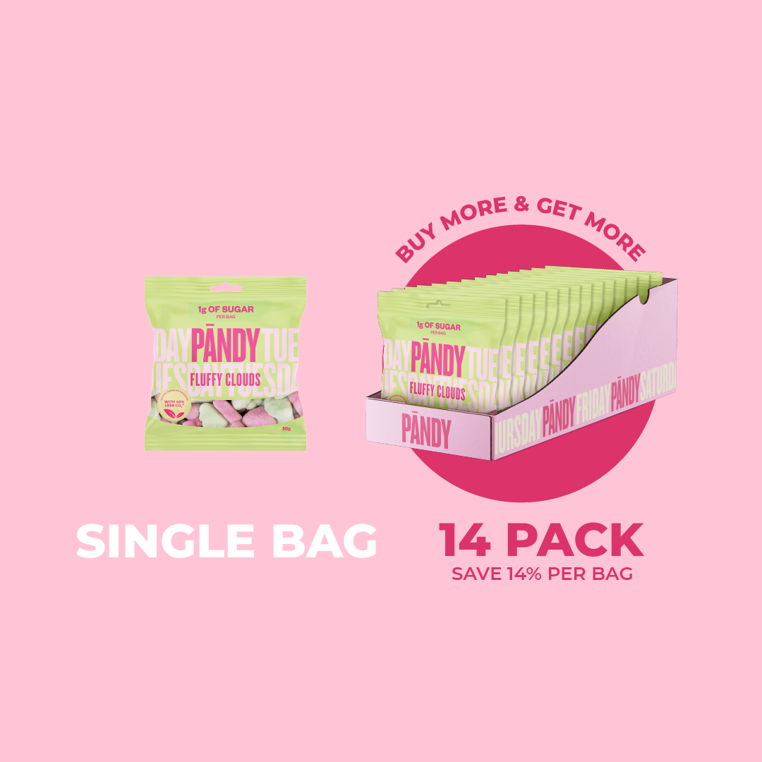 Fluffy Clouds – Skumgodis med smak av söta smultron och syrligt grönt äpple.